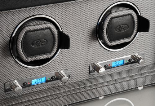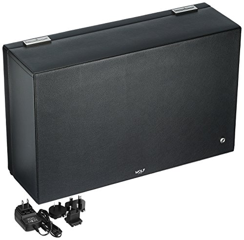 -. Feature : Dimensions: 20W x 6.5D x 13H in. / 8 winder modules / Black faux-leather frame with silver textured silk lining / Locking glass cover / Chrome-finished hardware and backlit LCD display