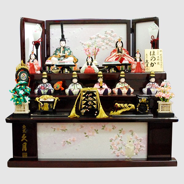 ・台座・屏風等には落ち着いた色目の雛人形セット。