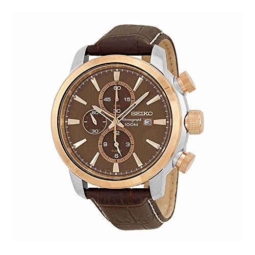 Stainless steel case with a brown leather strap. Fixed rose gold ion-plated bezel. Brown dial with luminous skeleton hands and index hour markers. Minute markers around the outer rim. Dial Type: Analog. Luminescent hands and markers. Date display at the 3 o'clock position. Chronograph - three sub-dials displaying: 60 second, 60 minute and 12 hour (alarm). Quartz movement. Scratch resistant Hardlex crystal. Solid case back. Case diameter: 45 mm. Case thickness: 11 mm. Round case shape. Band width: 22 mm. Tang clasp. Water resistant at 100 meters / 330 feet. Functions: chronograph, date, hour, minute, second. Casual watch style. Seiko Sport Chronograph Brown Dial Brown Leather Mens Watch SNAF52.Feature