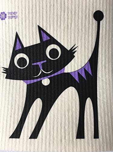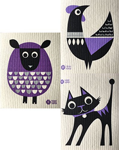 Swedish Dishcloths, Set of 3 DARK PURPLE-BLACK-GREY - Sheep + Rooster + Cat