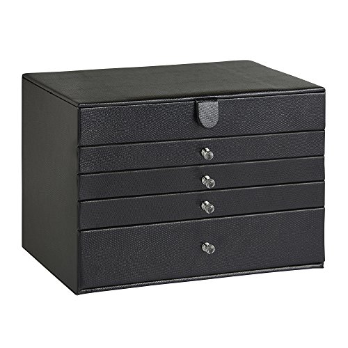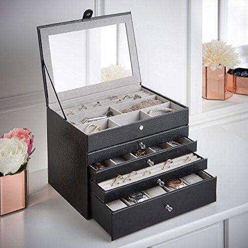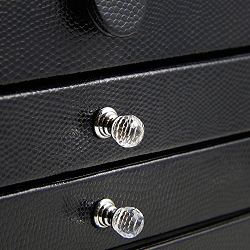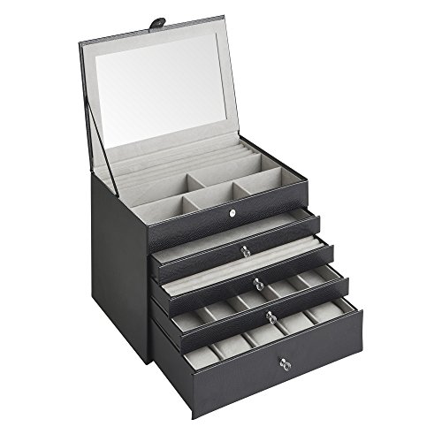 Beautify Black Faux Leather Jewelry Box Organizer with Drawers, Ring Holders, Watch Storage Case and Mirror
