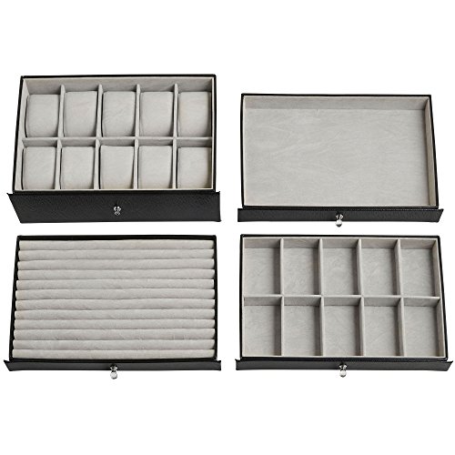 - Features 4 spacious drawers with crystallized handles - large open plan top drawer, 2nd drawer with 132 ring holder compartment, 3rd drawer with 10 rectangular storage sections and bottom drawer with 10 watch holder compartment