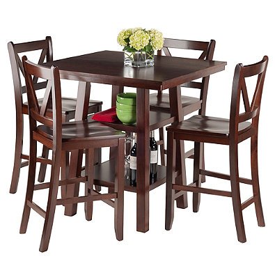 -. Brand : Winsome -. Color : Brown -. EAN : 0743074634961 -. Feature : Bring a warm rustic look to your living space with the Winsome Trading Orlando 5-Piece High Table and V-Back Counter Stool Pub Set / Includes: 1 table, | 200 lb. weight capacity4 stools | Table measures 33.8" D x 33.8" W x 36" H / Simple styling combined with function for country home antique appeal | 30-day manufacturer's parts warranty / Table has 2 shelves to store glassware or dishes | Easy to assemble | Imported / 24" counter stools offer comfortable seating | Finished in rich walnut | Rubber wood, MDF and veneer construction -. Label : WinsomeTrading. -. Manufacturer : WinsomeTrading. -. Model : N/A -. ProductGroup : Furniture -. ProductTypeName : HOME_FURNITURE_AND_DECOR -. Publisher : WinsomeTrading. -. Studio : WinsomeTrading. -. Title : The Winsome Trading Orlando 5-Piece High Table and V-Back Counter Stool Pub Set in Walnut -. UPC : 743074634961