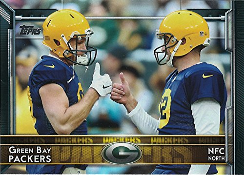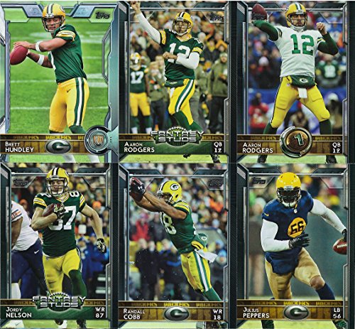 Green Bay Packers 2015 Topps complete regular issue 25 card team set including 5 different Aaron Rodgers cards (regular card #1, MVP #03, Topps 60 #357, Fantasy Studs #309 and All Pro #252), 3 different Eddie Lacy cards (regular card #10, Topps 60 #345 and Fantasy Studs #323), 3 different Jordy Nelson cards (regular card #3, Topps 60 #371 and Fantasy Studs #319), 2 different Randall Cobb, 2 different Clay Matthews, John Kuhn, Julius Peppers, James Starks,