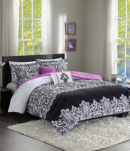 6 PIECE COMFORTER SUPERSET FITS BOTH FULL AND QUEEN MATTRESSES Generous Sizing Allows Comforter Set To Fit BOTH Full and Queen Mattresses. Set Includes: 1 Comforter (90" x 90"), 2 Matching Damask Shams (20" x 26"), 2 Decorative Throw Pillows (#1 Decorative Pillow features Embroidered Detail #2 Decorative Pillow Features a Trendy Lattice Pattern Design, 12"X16" / 16"X16") and 1 Home Style Brand Sleep Mask. Bedding is 100% Soft Microfiber Polyester. REVERSIBLE FOR ADDED VALUE. Gorgeous Black and White Damask Print on the Front, Solid Teal On the Reverse- Reversible for 2 Completely Different Looks for Added Value. BLACK WHITE AND TEAL BEDDING IS TRENDING FOR GIRLS AND TEENS BEDDING. Color Combination of Black White and Teal is An Easy Choice For Girls and Teens That Will Look Both Fun and High End. EASY BEDROOM MAKEOVER THAT IS STYLISH MODERN AND GIRLY Gorgeous and Fun all at once! A Modern remake of Classic Damask, with Black and White Pattern on the Front, and Trendy Teal Blue Solid Reverse Side. Coordinating Pillow Shams and 2 Decorative Throw Pillows Make Decorating Easy! SUPER SOFT AND WARM BEDDING THAT IS COMFORTABLE ALL YEAR. Soft and Cozy! Perfect Weight That is Comfortable All Year. Perfect for Girls, Teens or Adults. 1 Home Style Brand Sleep Mask- Our Exclusive Sleep Mask will help you find the perfect night's sleep. Home Style TM offers an exclusive 1 year Warranty for our Home Style Sleep Mask. This warranty is exclusive to Home Style, and only purchases made through Home Style are covered under this 1 Year Home Style Sleep Mask Warranty.Feature