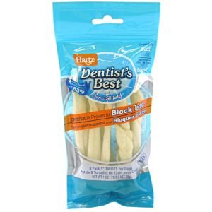 -. Binding : Misc. -. Brand : HARTZ -. Feature : Pet Food / Your dog will love you -. Label : HARTZ -. Manufacturer : HARTZ -. PackageQuantity : 1 -. ProductGroup : Pet Products -. ProductTypeName : PET_SUPPLIES -. Publisher : HARTZ -. Studio : HARTZ -. Title : Dentist's Best Rawhide Twist Dog Treat (8 Per Pack)