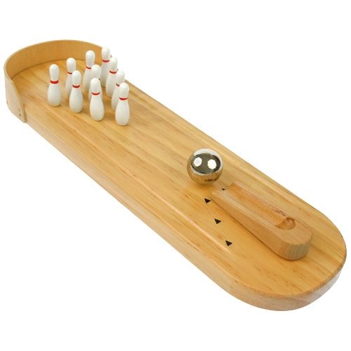 - Feature : Desktop wooden mini bowling game / 3.5" wide x 12" alley with a 1" x 3" ball shooting ramp / Includes ten 1.25" white bowling pins, and one 0.5" metal bowling ball / Moveable ramp to allow for the perfect strike