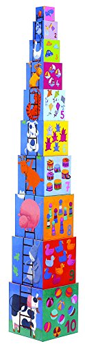 10 cubes of colorful fun! These funny cubes will provide hours of stacking and nesting fun while learning new shapes, numbers, animals, and more! Enjoy engaging drawings on five sides of the ten cubes while counting, building a tower, hiding things in and under the cubes and nesting them in one another, too.Because play is essential to a child's development, Djeco creates toy collections that are always entertaining, educational and imaginative. Staying faithful to their philosophy of incorporating art into play, the passionate and inventive Djeco creative team includes unique illustration and bold graphic design into all of their toys.