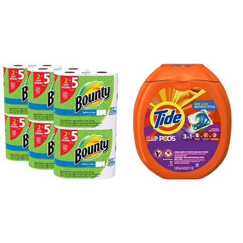 -. Feature : Bounty Select-a-Size Paper Towels is 2X more absorbent,* so you can use less (*Vs. the Custom-Size-It® brand in the U.S. and the Premium Green Leaf Towel in Canada.) / 12 Huge Rolls = 30 Regular Rolls / Tide PODS SP.R.Ing Meadow Scent: 6x more clean*. (*Based on stain removal performance of 1 pac of Tide PODS vs. 6 doses of the leading liquid bargain brand base variant in a standard top loading machine) / 3-in-1 laundry pacs: detergent, stain remover, brightener. / Tide PODS laundry pacs dissolve quickly in hot & cold.