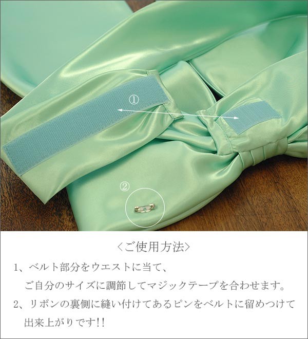 ■ご使用方法■ 1、ベルト部分をウエストに当て、ご自分のサイズに調節してマジックテープを合わせます。 2、リボンの裏側に縫い付けてあるピンをベルトに留めつけて出来上がりです!!