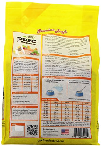 10lbs bag contains USDA Chicken, Chickpeas, Flax, Carrots, Celery, Apples, Bananas, Blueberries, Cranberries, Pumpkin, Papaya, Spinach, Garlic, Vitamins and Minerals