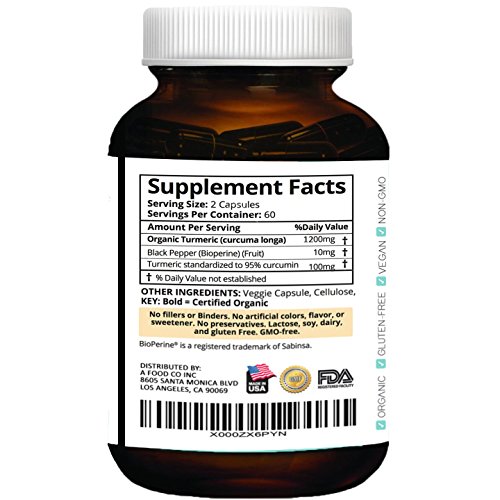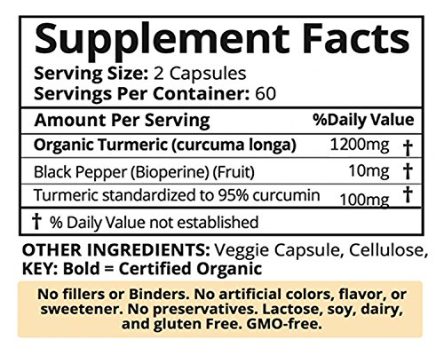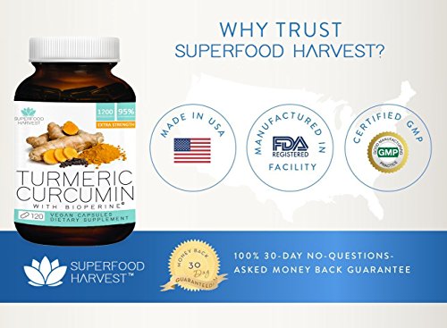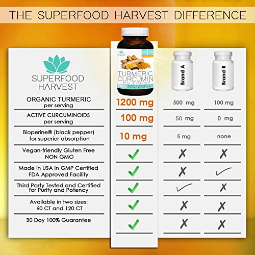 -. Binding : Health and Beauty -. Brand : Superfood Harvest -. EAN : 0765407250457 -. Feature : 100% MONEY BACK GUARANTEE - If you are not completely satisfied with our turmeric capsules we will provide you with a full refund, no questions asked! We love our customers! / NATURALLY HEALTH PROMOTING - our turmeric capsule supplement helps relieve joint & back pain, reduce inflammation and skin dryness, boost brain function & memory, improve digestion and blood circulation, enhance immune and nervous system. It promotes healthy joints, eyes, skin, hair, heart and mood! / 100% ORGANIC TURMERIC - Our turmeric curcumin capsules with curcumin and black pepper extract ( Bioperine ) are Organic, Raw, Gluten-Free, Vegan, Non-Gmo, Non-Irradiated, Nothing Added and All Natural / EXTRA STRENGTH - 1200 mg of powerful turmeric per serving with 95% curcuminods and bioperine / MADE IN THE USA - Our turmeric pills are manufactured in the USA with the highest quality ingredients formulated for your ultimate health -. IsAdultProduct : 0 -. Label : Superfood Harvest -. Manufacturer : Superfood Harvest -. MPN : TS -. PackageQuantity : 1 -. PartNumber : TS -. ProductGroup : Health and Beauty -. ProductTypeName : HEALTH_PERSONAL_CARE -. Publisher : Superfood Harvest -. Studio : Superfood Harvest -. Title : Organic Turmeric Capsules with Curcumin | 1200mg (120 Vegan Capsules) | Extra Strength Supplement with Bioperine® for Best Absorption and 95% Curcuminoids - Organic, Non-GMO, Made in USA ... -. UPC : 765407250457