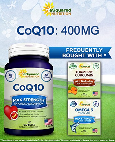 -. Binding : Health and Beauty -. Brand : aSquared Nutrition -. EAN : 0641799787538 -. Feature : MAXIUMUM STRENGTH 400MG PER DAILY DOSAGE - Our top rated supplement delivers 400 mg of 100% pure coenzyme Q10 (CoQ10) per daily intake. Our high absorption CoQ 10 formula is naturally sourced and packs in 400mg per serving / BEST VALUE ON AMAZON - 200 CAPSULES - EXTRA STRENGTH - You receive 200 capsules of extra strength COQ10 (400mg) for a FULL 200 day supply (others offer half for a more expensive price), all backed by our "best in the industry" 100% MONEY BACK GUARANTEE / HEART HEALTH - Coenzyme Q10 has been clinically shown to support heart health, improving blood pressure, boost overall cardiovascular health, and reduce the normal signs of aging. CoQ10 helps maintain a healthy cholesterol and blood sugar levels. Co enzyme Q-10 s required for a variety of metabolic pathways including promoting "good" HDL cholesterol and monitoring blood glucose. / FIGHT AGING - CoQ10 has shown to increase your energy and stamina levels, support your nervous and immune system, and act as a powerful antioxidant to help fight free radicals which damage your cells. As humans age, naturally CoQ10 levels decrease - and CoQ10 is essential for cellular energy product, high energy levels, and heart health. C o Q10 is know for its ability to improve endurance and defend cells against the effects of harmful oxidation. / HIGHEST QUALITY AVAILABLE: We use pure CoQ10 free of extraneous fillers, binders and artificial ingredients to ensure no unwanted side effects for you! We go the extra mile to ensure our supplements have passed extensive quality control testing before being bottled and sold. We use only FDA registered and GMP compliant manufacturing facilities in the USA. You can rest assured that you are receiving a high-quality product each time you buy from aSquared Nutrition. -. IsAdultProduct : 0 -. Label : aSquared Brands -. LegalDisclaimer : These Statements have not been evaluated by the Food and Drug Administration. This Product is not intended to diagnose, treat, cure or prevent any disease. -. Manufacturer : aSquared Brands -. PackageQuantity : 1 -. ProductGroup : Health and Beauty -. ProductTypeName : HEALTH_PERSONAL_CARE -. Publisher : aSquared Brands -. Studio : aSquared Brands -. Title : Pure CoQ10 (400mg Max Strength, 200 Capsules) - High Absorption Coenzyme Q10 Ubiquinone Supplement Pills, Extra Antioxidant CO Q-10 Enzyme Vitamin Tablets, COQ 10 for Healthy Blood Pressure & Heart -. UPC : 641799787538