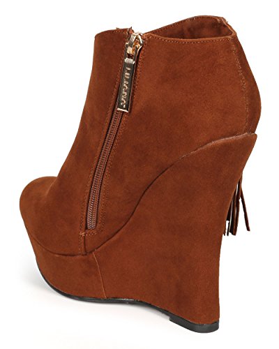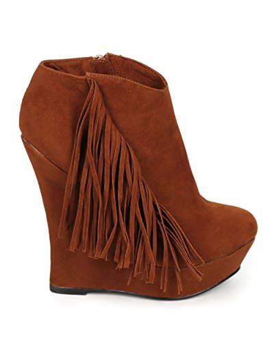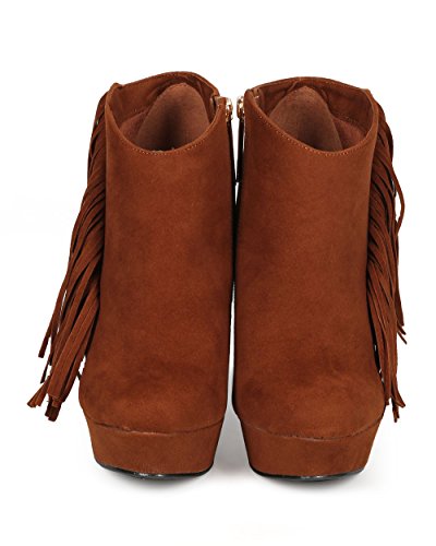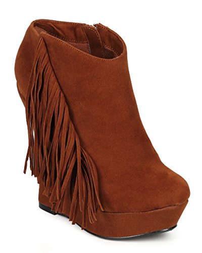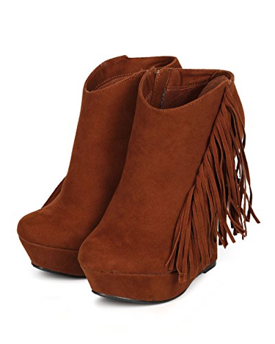 Liliana CG66 Women Suede Fringe Platform Wedge Ankle Bootie - Cognac