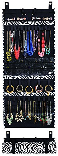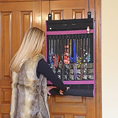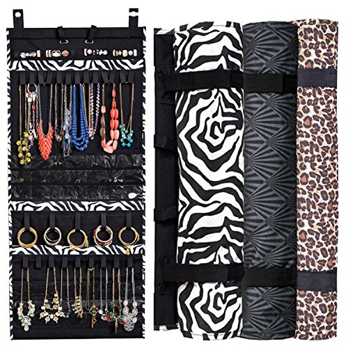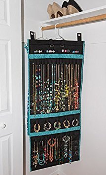 -. Feature : HOLDS OVER 150 PIECES: This jewelry storage organizer by Donna Walsh can hold over 44 necklaces, 25 bracelets, 42 pairs of earrings, and 30 rings on its ultra-strong loops and clear pockets with its patented design; far much more than most jewelry armoires, jewelry storage trays and bags. / DRESS MUCH QUICKER: You'll know what you want to wear at a glance and access all your jewelry without any tangle or having to take off other pieces. Buy an additional jewelry roll organizer to categorize your precious or costume pieces according to color, metal, or gem type for even quicker access. / GREAT FOR TRAVEL: Whether you're going on vacation,moving, or on a business trip, you can simply roll up the jewelry holder organizer and fit it into your lage. This folding travel jewelry organizer is also great for discreet jewelry organization, or for keeping your valuable pieces beyond the kids' reach. / FITS ANY SPACE: This over the door jewelry organizer comes with thin, sturdy hooks that easily fit over any bedroom or closet door. It also attaches to a hanger for closet storage and can be used as an on the wall jewelry organizer. / BEAUTIFIES YOUR ROOM: Available in lovely colors and stylish P.R.Ints, this fabric jewelry craft organizer adds a modern and beautiful touch to any space. And with the durable polyester design of this long roll up jewelry stem organizer, you'll enjoy unrivaled value for your money.