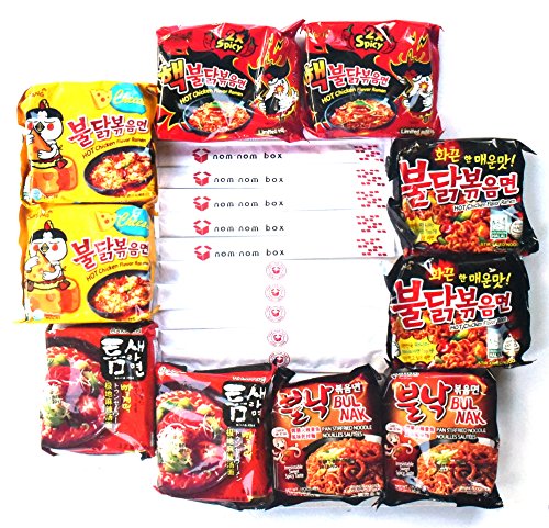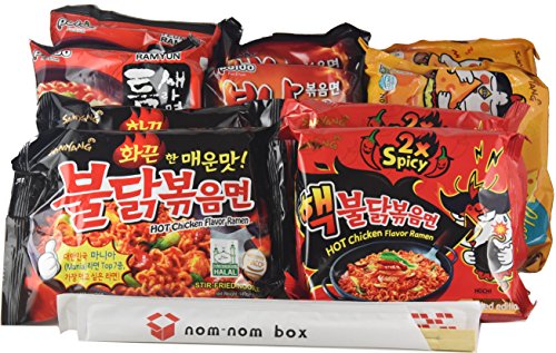 Korean Spicy Hot Ramen Variety (10-Pack) Samyang Spicy Chicken Roasted Noodles Hek Buldak, Paldo Bulnak Teumsae & Nom Nom Box Chopsticks (10 Count)