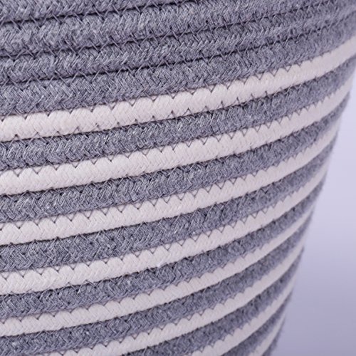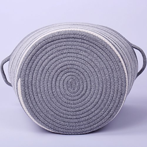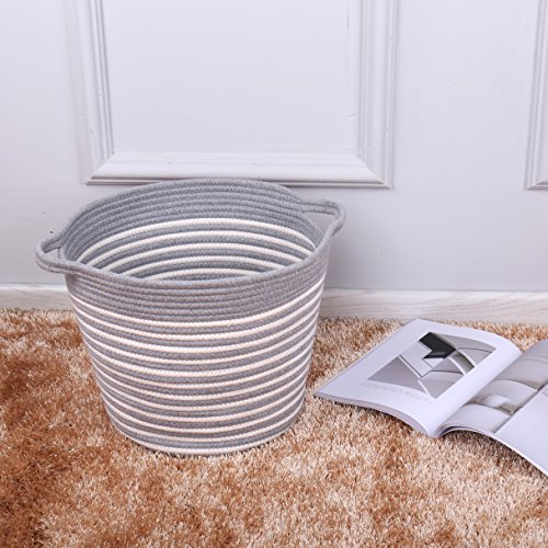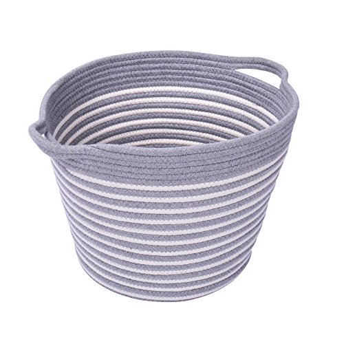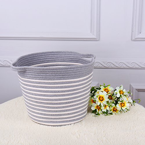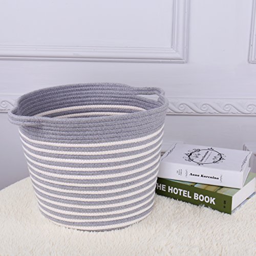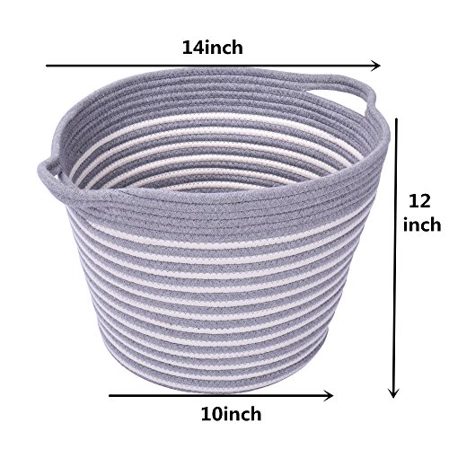 Product Material: Made from 100% thick cotton ropes Product Dimensions: 14x 10x 12(H)inches Product Features: 1.Sturdy frame stands up to everyday use in bathrooms, bedrooms, laundry rooms or closets, perfect for toy storage,towels srorage, pillows, blankets, books, magazines and diaper storage 2.Each basket has cotton rope handles on both sides for easy Transport,make everything easy to grab and move. Handles on each end make carrying it convenient and comfortable. 3.Fashionable and Robust,Matches interior Decor of any household or office, This can easily be used for a variety of uses due to it being fairly neutral in color 4.A larger size of 16.5 (L) x 12.5 (W) x 10 (H) Inches allows for more storage 5.Great Gift Idea,this basket is durable and stylish 6.Modern and stylish design perfect for room decor,This cute fabric basket perfect for organizing a clothing closet, bathroom,living room or even an office. It is so universal and can work anywhere you are looking to get organized. Perfect for (1).Closet in rooms: clothes, hats, belts, etc. (2).Living room: magazines, books, controls, remotes, candles, DVDs, board games (3). Bathroom: tissue, sundry storage, combs, beauty supplies, makeup (4). Family Room: toys, blankets, games, clothes (5). Laundry room: cleaning supplies, detergent, cloths