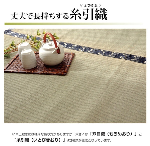 い草は長いものほど高級になります。い草は先端部分が赤茶色く、根元が白く真中が青(緑)色です。真中の良質な青の部分を多く使用するほど、丈夫で綺麗な仕上がりとなります。またイ草は使用するうちに日焼けをしますが、真中の青の部分を多く使用したものほど、全体が綺麗にムラなく日焼けし、味が出ます。こちらの商品は畳表と同じ織り方の糸引織で仕上げました。双目織りと比べて、い草の打ち込み本数が多いため丈夫です。表面が滑らかなので、ホコリなどがたまりにくいのが特徴です。長くご使用されたい方や、耐久性をお求めの方には糸引織をおすすめします。