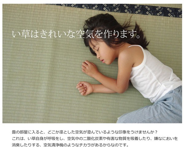 い草には空気の清浄化作用、湿度の調節作用があり、汚れにくいといった特徴があります。青森県のヒバの木から抽出した「ヒバエッセンス」をメーカー独自の技術で生地表面に加工しました。ヒバエッセンスにはヒノキチオールという、天然物質としては極めて抗菌性の高い成分が含まれています。(無加工品に比べ抗菌、防臭効果があります。)