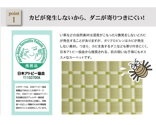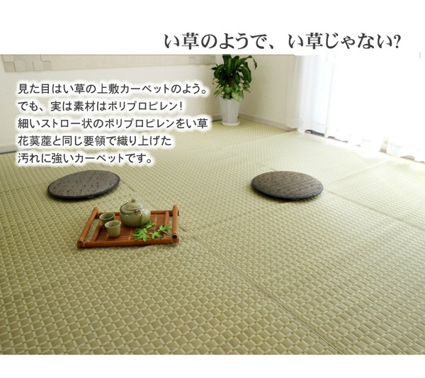 ポリプロピレン素材を細いパイプ状にして織り込んだ敷物で、強度が高くしっかりとしています。汚れても水洗いができるので、いつでも清潔にお使いいただけます。お子様の部屋に、アウトドアに、ペットのいるご家庭に最適な万能カーペットです。※こちらの商品は二方にヘリを付けています。