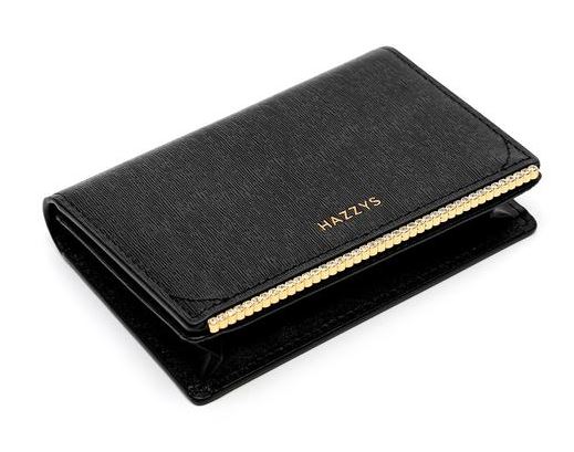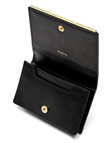 모헤어 엠보 가죽 소재에 블랙 컬러 바탕과 골드 큐빅 바 장식으로 포인트를 준 카드지갑 입니다.