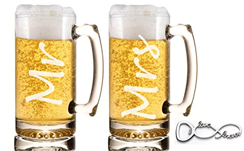 Each set consists of two sturdy 27 oz. beer mugs and one infinity shaped, "Love Forever" bottle opener. BYOB, beverages not included.