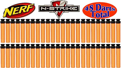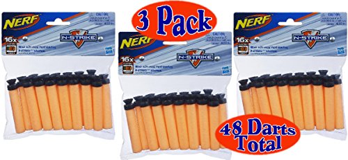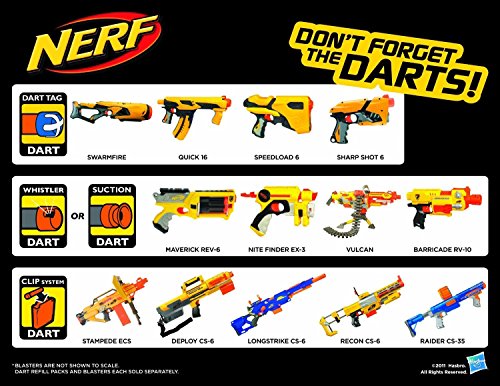 Studio : Hasbro Publisher : Hasbro Binding : Toy Product Description From the Manufacturer Load up your Nite Finder EX-3, N-Strike Maverick or N-Strike Vulcan EBF-25 blaster (each sold separately) with this 36-pack of Suction Darts and keep the game going even longer. These foam darts are specially designed for high-flying, high-performance blasting and even stick to most flat surfaces through suction power to mark your target. Product Description Keep the game going even longer! Load up your Nite Finder EX-3 blaster, Maverick REV-6 blaster, or any other blaster that uses suction darts (each sold separately) with this 48-pack of Suction Darts. These foam darts are specially designed for high-flying, high-performance blasting and even stick to most flat surfaces through suction power to mark your target! 0