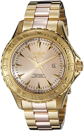 -. Binding : Watch -. Brand : Invicta -. Color : red -. Department : mens -. EAN : 0886678190157 -. Feature : Japanese quartz movement / Mineral crystal; 18k gold ion-plated stainless steel case and bracelet with 18k rose gold ion-plated stainless steel center links / Date window at 3:00 / Rose gold tone dial with gold tone and pale green hands and gold tone hour markers; unidirectional 18k gold ion-plated stainless steel bezel / Water resistant to 660 feet (200 M): suitable for recreational scuba diving -. Label : Invicta -. Manufacturer : Invicta -. Model : 15497 -. MPN : 15497 -. PackageQuantity : 1 -. PartNumber : 15497 -. ProductGroup : Watch -. ProductTypeName : WATCH -. Publisher : Invicta -. ReleaseDate : 2013-12-17 -. Studio : Invicta -. Title : Invicta Men's 15497 Pro Diver Analog Display Japanese Quartz Two Tone Watch -. UPC : 886678190157