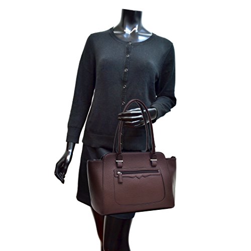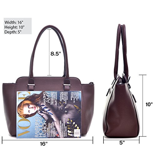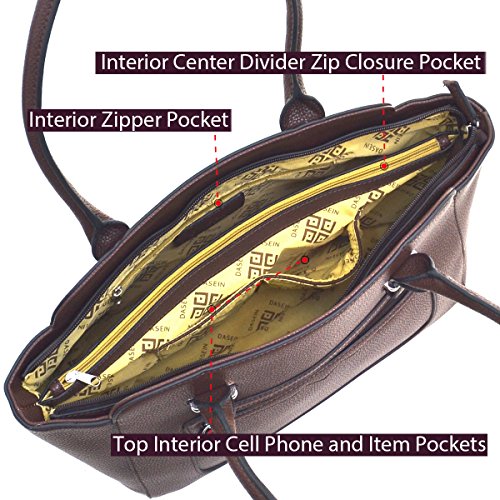 Product Description About This Bag ? With this faux leather satchel, you'll look sleek and chic. It features two top handles and a center zip divider. Top zip closure to secure all of your must-haves. Your look just got a major upgrade, courtesy of this satchel! ? This bag measures 16"W x?10"H x?5"D, We suggest comparing it to a bag you already own to make sure it's the size you want! ? Quality guarantee by Dasein: we take quality seriously. You won't get bags that fall apart within weeks or signs of less-than-perfect craftsmanship that are common for handbags in this price range. ? Don't be fooled by its chic, compact look; the highly organized and spacious interior will fit your wallet, iPad, phone, keys, sunglasses, makeup, and more! ? We take extra care to eliminate chemical odors that are commonly found with faux leather bags. If you still detect a smell, unzip the bag and leave it in a ventilated environment for a couple of days. About Dasein