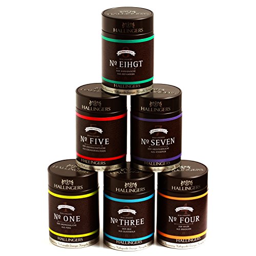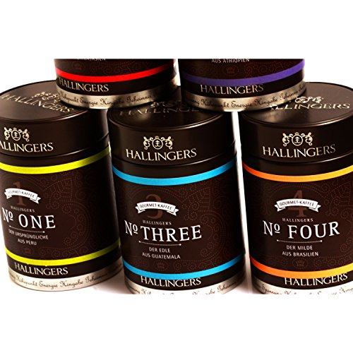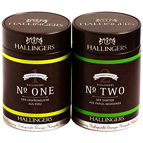-. Feature : Feinster Gourmet-Kaffee von Hallingers, täglich frisch geröstet - ein Set aus unseren besonders natürlichen Kaffees No. One und No. Two / Bedonders Magen-schondend, voll-aromatisch und bekömmlich, da Langzeit-geröstet bei niedrigen Temperaturen / Nur elesenste Bohnen werden verwendet, frei von Konservierungsstoffen, möglichst Natur-belassen / Die Verpackungs-Designs von Hallingers sind international ausgezeichnet (u.a. Red Dot Design Award 2013, German Design Award Special Mention 2014) / Ein Hochgenuss für Gourmets zum Verschenken oder zum selbst Genießen