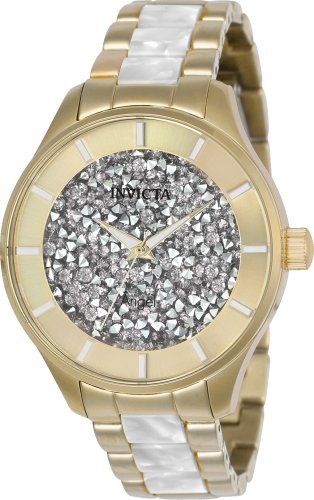 Invicta 24666 Angel women's watch features a 40mm wide and 12mm thick yellow gold plated solid stainless steel case with a fixed bezel and textured push-pull crown. Invicta 24666 is powered by Japanese TMI PC21 quartz movement. This beautiful watch also features a textured white crystals accented gold tone dial with white accents gold tone luminous hands and index hour markers, scratch resistant flame fusion crystal and water resistant to 100 meters. Invicta 24666 is equipped with an 18mm wide two tone white and yellow gold plated solid stainless steel bracelet with a fold over push button clasp. Invicta 24666 women's Angel white crystal accented gold dial two tone bracelet watch is brand new and comes in an original Invicta gift box and is backed by a 5 year limited warranty.Feature