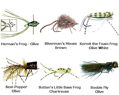 -. Feature : 6 Select Bass Flies / Innovative and professionally tied flies from Montana Fly Company / Herman's Frog - Olive #04, Boobie Fly - Olive, / Sutton's Little Bass Frog - Chartreuse #08, Sexi-Popper - Olive - Medium / Kermit the Foam Fly - Olive/White #6, Silverman's Mouse - Brown #06