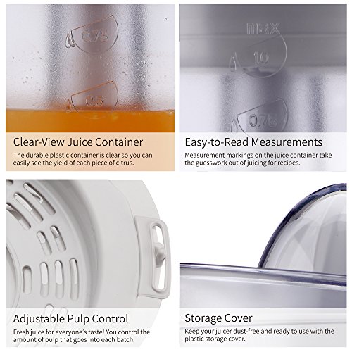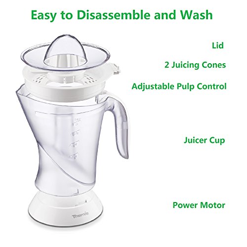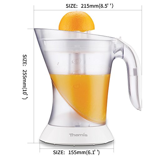 Black Friday & Cyber Monday Sales! Price marked down from $23.99 to $17.99! Order now and save big today~! The THEMIS-CJ3371 Citrus Juicer combines high performance with sleek, modern design to make your juicing experience better than ever. This family size juicer lets you easily prepare fresh drinks for the entire crew. You can make fresh juice to get the day off to a good start, or lemonade and limeade to cool off on a warm afternoon. This juice extractor has a large 34 oz capacity, so you can make some more and keep it refrigerated. Two cones rotate both ways to squeeze every drop of juice from fruit! The small cone squeezes more juice from small fruits like oranges, lemons and limes, while the large cone is perfect for grapefruit. The quiet yet powerful 25W motor provides enough power to easily extract as much as orange juice in an effortless way in seconds. The adjustable pulp strainer lets you precisely control the amount of pulp in each drink. Pulp collects in the removable basket during juicing so you can dispose of it or use it in other recipes. It is very easy to clean and store. The storage cover keeps your juicer dust-free and ready to use.The built-in cord storage keeps the cord neat and out of the way. All removable parts are dishwasher-safe for fast and easy cleanup.