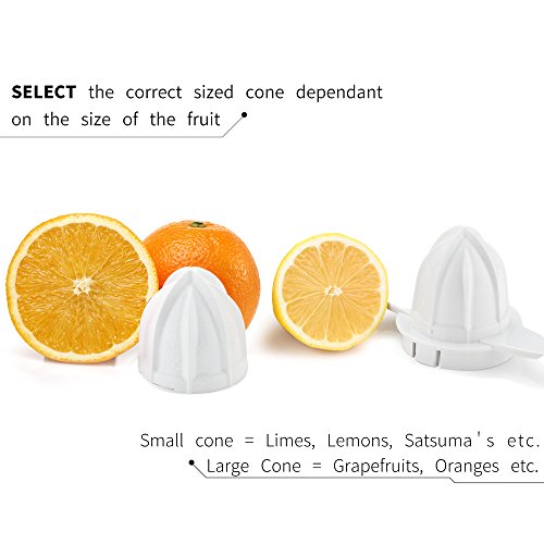 2 Self-Reversing Cones - Two cone sizes handle large and small citrus. The small cone squeezes more juice from small fruits like oranges, lemons and limes, while the large cone is perfect for grapefruit.