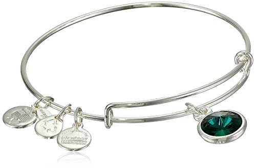 Handmade bangle bracelet crafted from recycled material and featuring faceted birthstone and three stamped Alex and Ani charms
