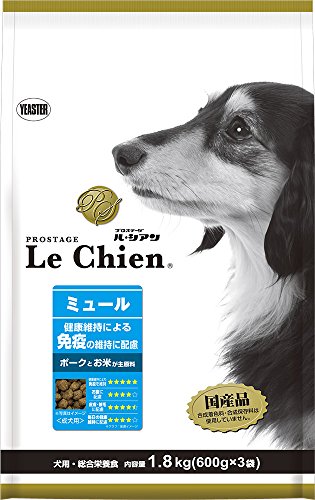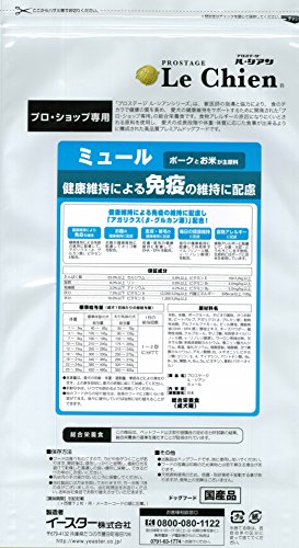 原材料:米粉、米糠、ポークミール、タピオカ澱粉、かつお粉末、ビートパルプ、アガリクス(βーグルカン源)、動物性油脂、アルファルファミール、ビール酵母、精製魚油(DHA・EPA源)、酵母エキス、チーズパウダー、植物性油脂、ケルプミール、オリゴ糖、月見草オイル(リノール酸、γ-リノレン酸源)、ウーロン茶抽出物、ミネラル類(未焼成卵殻カルシウム、第二リン酸カルシウム、食塩、塩化カリウム、硫酸亜鉛、硫酸銅、ヨウ素酸カルシウム)、アミノ酸類(DL-メチオニン)、ビタミン類(コリン、E、A、ナイアシン、パントテン酸、B2、B1、B6、葉酸、K、B12、D3、ビオチン)、香料(バターオイル)