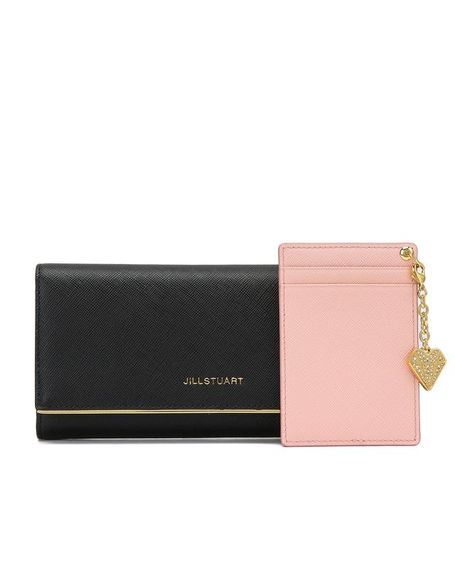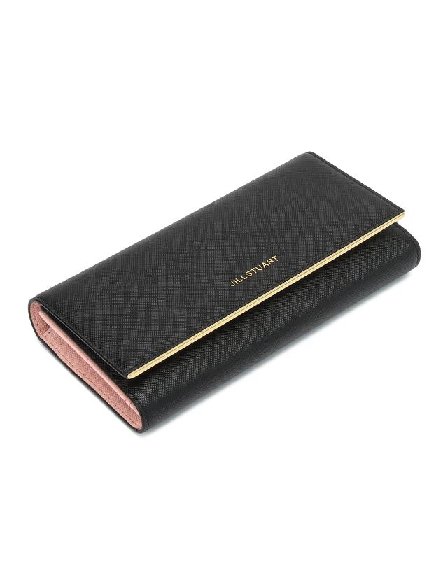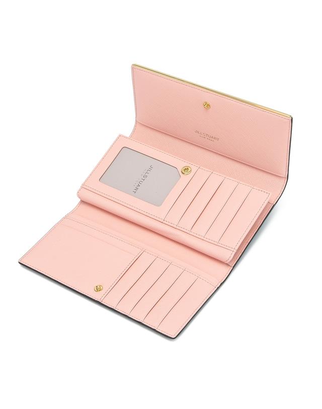 얇은 골드 바와 로고 장식으로 포인트를 주었으며 밝은 핑크 내부 배색으로 세련된 외관을 연출한 장지갑입니다.