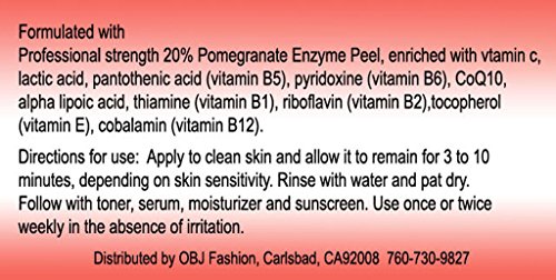 - Feature : A Clinical Strength Chemical Peel Treatment. Result in immediate clarity and smoothness in the skin. Each bottle contains approx. 30-35 full facial Peels / Pometranate Extract is packed with essential nutrients and vitamins. It increases cell turnover rate, and promotes healthy production of collagen and elastin, perfect for smoothing out wrinkles, lines, and improving tone and texture. / This Pometranate Enzyme peel provides a high concentration of beta-carotene, vitamins A, C, zinc, and potassium which fight against free radicals and damage from sun exposure / Pometranate contains proteolytic enzymes, which help in breaking down the keratin bond between dead cells. This allows the sloughing of the outer layer of dead cells without damaging the inner living cells. Vitamin C, also present in pumpkins, is another active antioxidant beneficial in warding off free radicals. / Safe and Natural Ingredients. Made in USA in an FDA registered facility