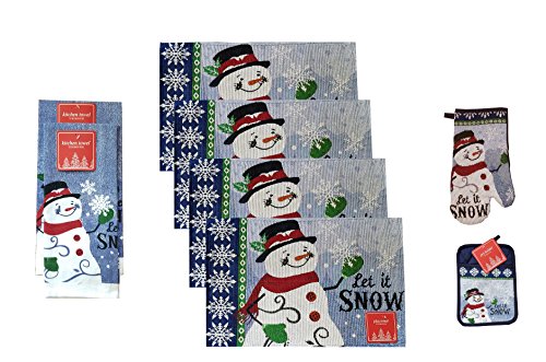 -. Feature : Delightful Snowman pattern "Let It Snow" kitchen set will brighten your dining area this Christmas Season / Set includes 4 tapestry placemats, 2 decorative kitchen towels, 1 pocket pot holder and 1 oven mitt / Placemats measure 13 x 19; East cotton towel measures 15 x 15 inches / Quilted pocket potholder is 7 x 9 inches; Quilted oven mitt is 11 x 7 inches. / Dress up your kitchen for the Christmas Holidays with this cute Snowman pattern