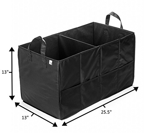 2 large compartments and 3 side pockets. The rigid base plates ensure the trunk organizer won't slide around when the car is moving. Built in handles for easy transportation. Fully expanded measurement: 25.5" x 13" x 13"