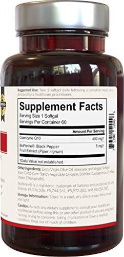 HIGH POTENCY VEGETARIAN FORMULA - Achieve the daily cellular support you need in just one small, easy-to-swallow veggie softgel featuring 400mg of Co Q10 with 60 servings per bottle. Encapsulated in veggie softgels for restricted diets!