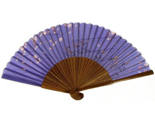 Japanese Design Silk Handheld Folding Fan, Light Purple with Pink Cherry Bloosom Flowers and Golden Grains HF-153