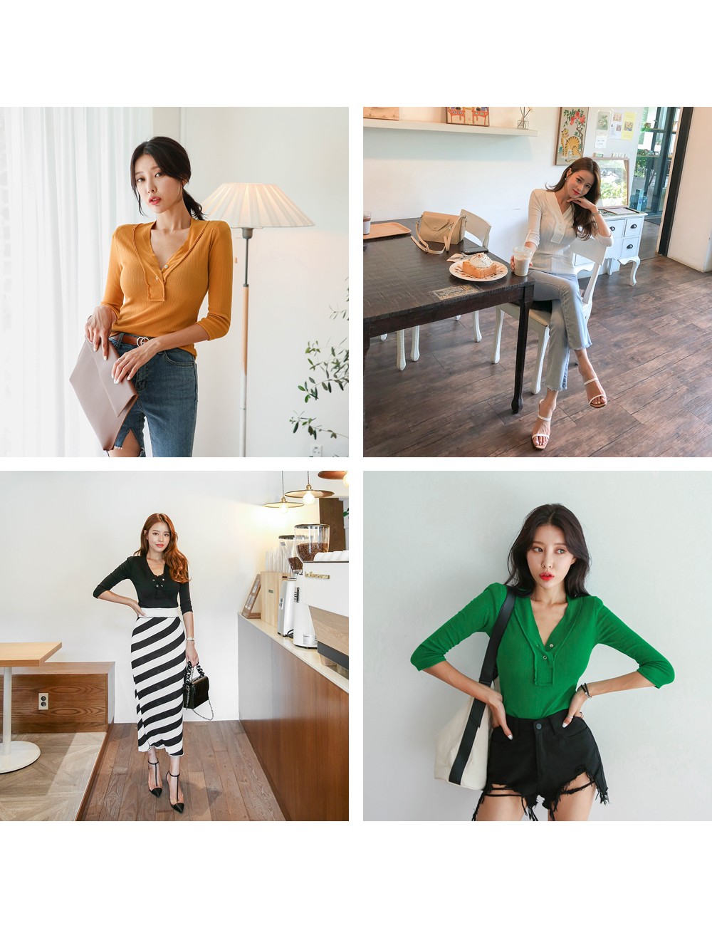 데일리하게 입기 좋은 슬림한 골지티를 소개할게요~ 신축성 좋은 골지원단으로 브이네크라인으로 스냅단추로 포인트를 준 아이인데요 데끼컷팅으로 마무리하여 좀더 빈티지하면서도 독특한 매력을 느끼실 수 있어요 어깨패드가 내장되어 라인을 잡아주어 더욱더 예쁜라인을 잡아준답니다 7부 기장감의 소매기장으로 지금부터~ 간절기 시즌까지 두루두루 입기 좋아요 이너 아이템으로도 활용하기 좋고 단품으로 입어도 데일리해서 너무 좋아요 모델착장처럼 데님팬츠,스커트 등등 다양하게 연출 하기 좋아서 가격대비에 활용도가 높은 아이랍니다~ 평소 44반 사이즈를 착용 하는 모델들은 정사이즈 핏감으로 잘 맞았어요 Free(44-66)사이즈로 정사이즈 핏감으로 착용 가능 하세요