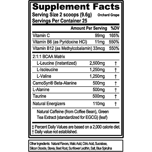 Ultrapremium BCAAS in proven 2:1:1 Ratio: L-LEUCINE Helps supply energy to muscles and support muscle protein synthesis.* L-ISOLEUCINE Supports muscle tissue development, recovery and lean body mass.* L-VALINE Plays a key role in supplying energy to muscles.* Recovery Energy and Endurance Boosters*: Beta Alanine Supports the buffering of lactic acid* L-ALANINE Supports glucose production for usable energy, endurance and recovery* TAURINE Supports cell hydration, metabolism and mental focus in combination with caffeine* VITAMIN B&C COMPLEX Vitamin B6 and B12 help support energy levels through intense workouts plus Vitamin C's powerful antioxidant helps support against stress and support healthy immune system.* Natural Energizers: Green Coffee and Green Tea Natural Caffeine sources for cleaner energy and antioxidantsFeature