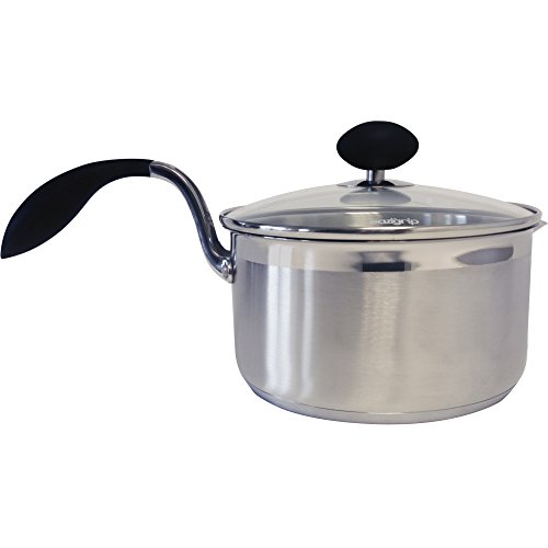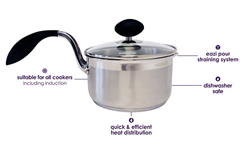 The Eazigrip 1.5 qt. Non stick saucepan is a durable and lightweight small pan with a composite base-stainless steel with an aluminum core-to distribute heat more evenly than an all-steel pot or pan could. This means cooking requires less energy and lower cooking temperatures. The Eazigrip lid is made from tempered glass (doesn't shatter) and includes a smart built-in spout and colander (small and large). it even has measuring lines inside the pot to use the pot as measuring cup and cookware! Eazigrip cookware is designed for comfort-with a distinctive handle to reduce strain on wrists and hands. This curved handle changes the way the pan or pot is gripped. In fact, it allows the wrist and hand to grip at a 42 Degree angle, the best position to give you control with the least amount of strain to the wrist. Handles are wrapped in silicone for added cushion and heat protection. The lid also has a handle on top. These handles give you control with the least amount of strain to the wrist. This makes it easier to lift full pots, and safer to move them from stove top to sink or plate. Pots and pans can rest on the edge of a sink, using the ledge as a lever to tip forward naturally and pour out water, etc. Protecting you from steam burns and awkward handling. The Eazigrip small saucepan is safe for use on gas, electric, and induction cooktops. This fine cookware is lasting, lightweight and durable. And comes with a lifetime guarantee from its maker Imperial great British design.Feature