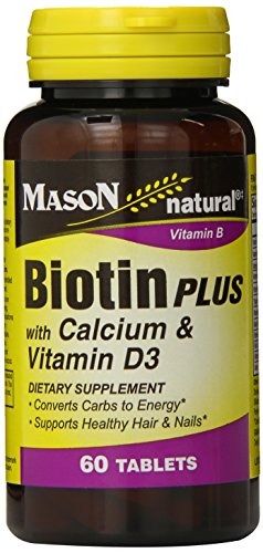 -. Binding : Health and Beauty -. Brand : Mason Vitamins -. EAN : 0311845148551 -. Feature : Converts carbs to energy / Supports healthy hair and nails / Dietary supplement -. Label : Mason Vitamins -. LegalDisclaimer : These statements have not been evaluated by the Food and Drug Administration. This product is not intended to diagnose,treat,cure or prevent ant disease. This product has been manufactured and packaged in strict conformance with industry & government standards. Mason Natural®is a registered trademark and does not refer to any product claim. -. Manufacturer : Mason Vitamins -. NumberOfItems : 3 -. PackageQuantity : 3 -. ProductGroup : Health and Beauty -. ProductTypeName : HEALTH_PERSONAL_CARE -. Publisher : Mason Vitamins -. Studio : Mason Vitamins -. Title : Mason Vitamins Biotin Plus with Calcium & Vitamin D 3 Tablets, 60-Count Bottles (Pack of 3) -. UPC : 311845148551