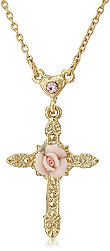 -. Title : Symbols of Faith 14k Gold-Dipped Crystal Pink Porcelain Rose Cross Pendant Necklace, 16" + 3" Extender