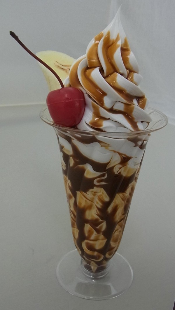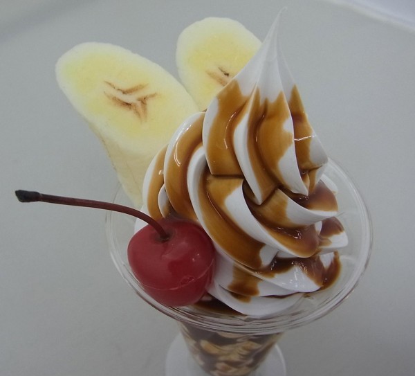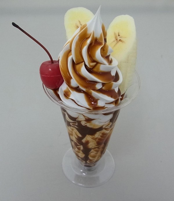 みんな大好きなパフェを職人が食品サンプルでつくってみました。クリームとチョコソースがからみあったところにバナナとさくらんぼをトッピングしました♪