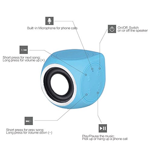 -. Feature : Mini cute wireless speakers, portable and lightweight, pefect for outdoor living, easy to hang on your bag with the supplied hook. / Bluetooth 4.1 & Perfect Sound: equiped with latest Bluetooth Version 4.1, perfect crystal and natural stereo sound with super audio performance. / Compatible with most of mobile phone, parts of PC which have Built-in Bluetooth. Ability to answer/hang-up/redial/refuse calls with the push of a button / Waterproof Design IP67: Effectively protect from water and dust, covered with silica gel cases, offer a comfortable touching feeling. it can work up to 80CM-1M depth, but you can not hear the music when dip this bluetooth speakers in more than 10CM depth, even though music still playing! / 1 x Mini Wireless Speaker