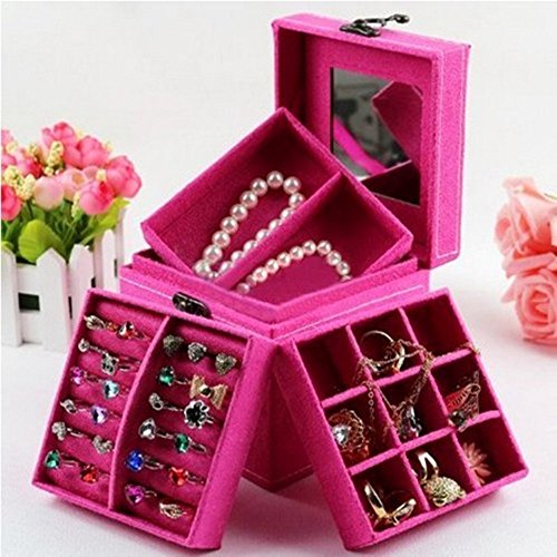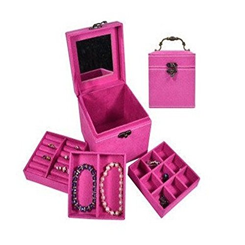KLOUD City Hot Pink three-layer lint jewelry box organizer display storage case with mirror
